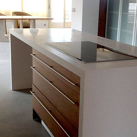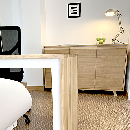 Lo más relevante del proyecto es el diseño y fabricación de las mesas de trabajo y muebles auxiliares, repartiendo los espacios del local para una mejor funcionalidad. Muebles fabricados con pino macizo combinado con DM lacado blanco, paredes blancas y un suelo laminado con malla cruzada son los 3 elementos que dan forma al nuevo aspecto
